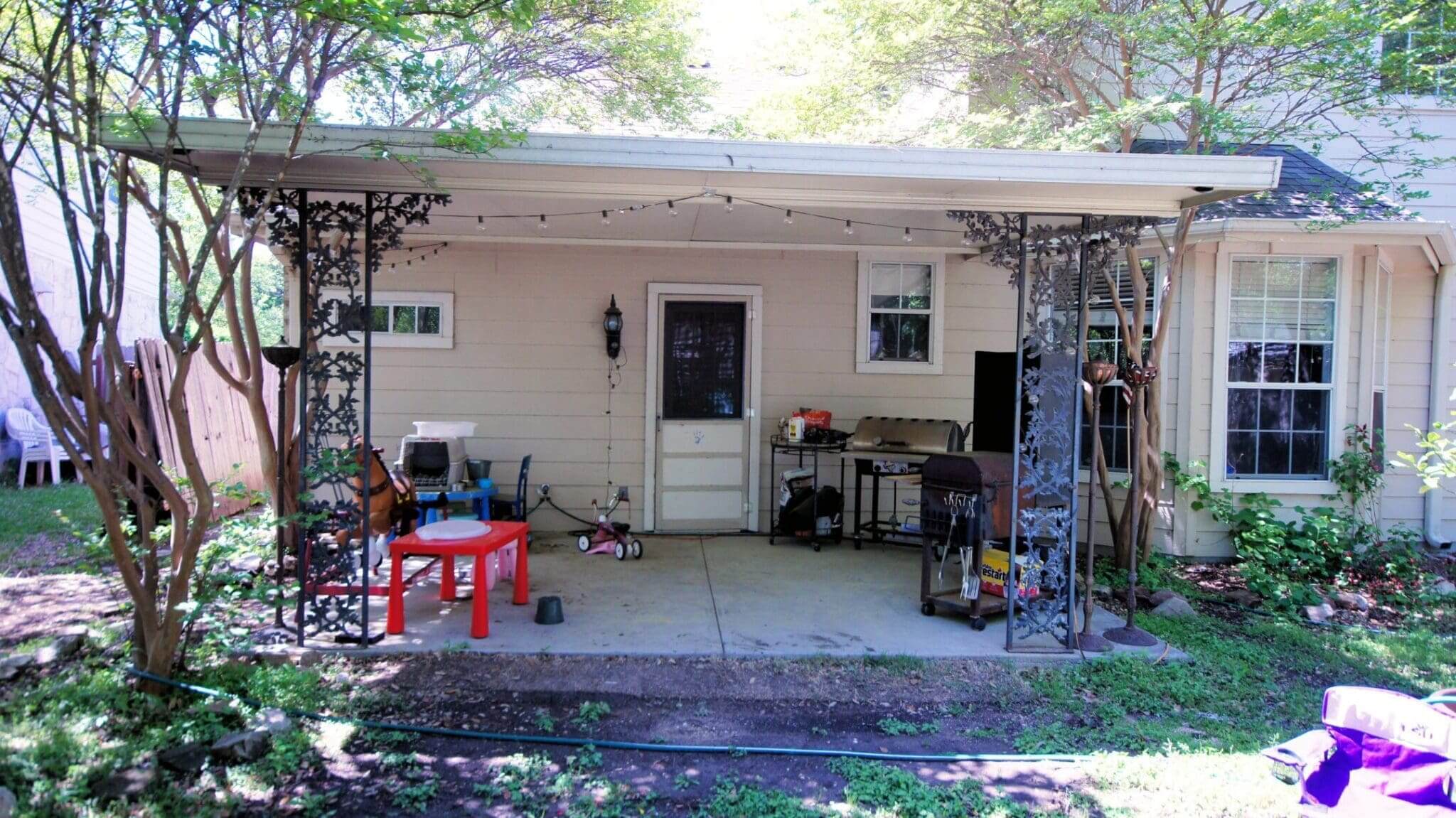 The old tin roof and ornamental iron posts were removed. The bay window on the house was converted to a backdoor, for easy access to the patio.