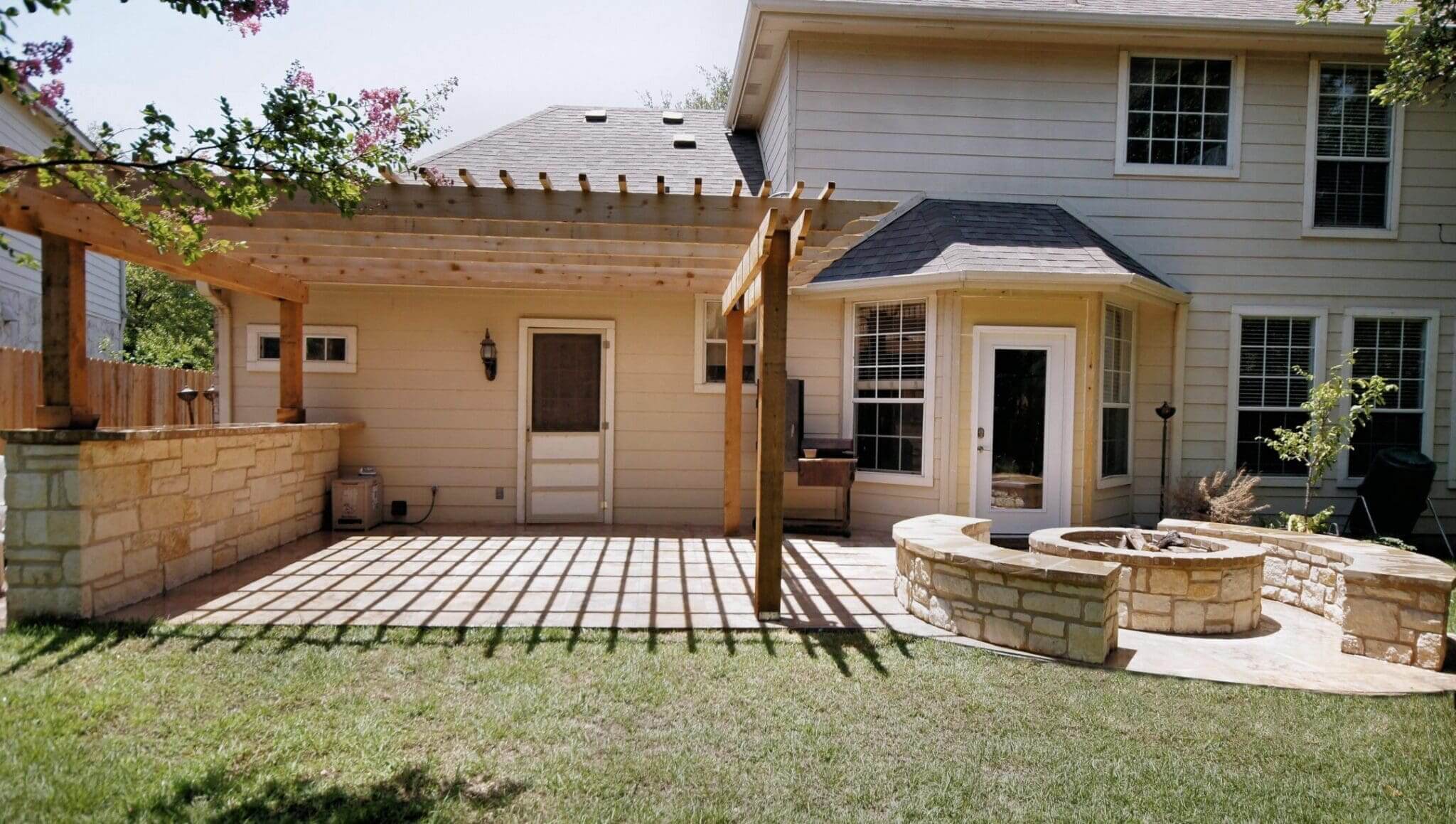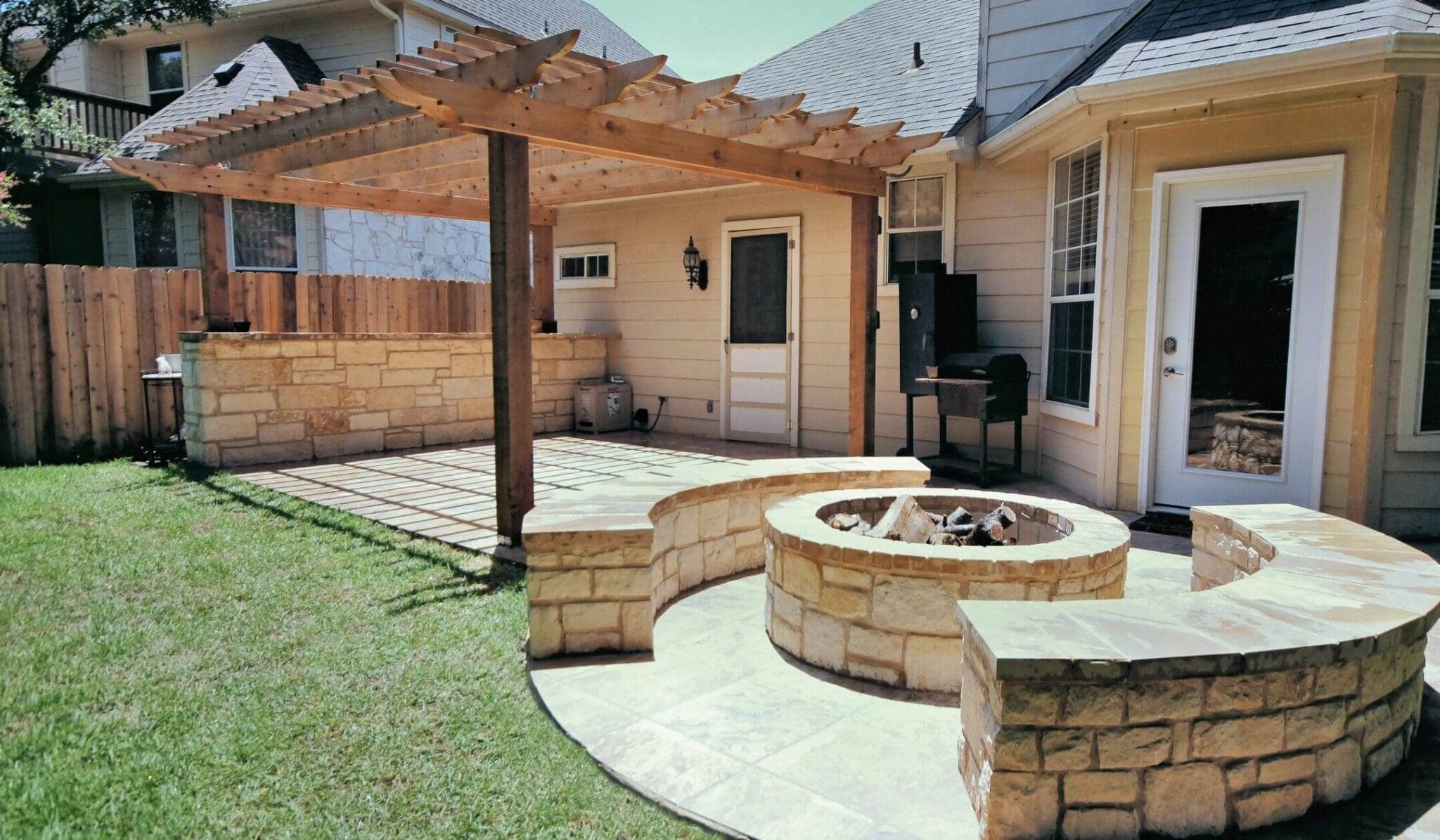 New concrete flooring, a pergola, and a custom Texas limestone fire pit with seating were all added.